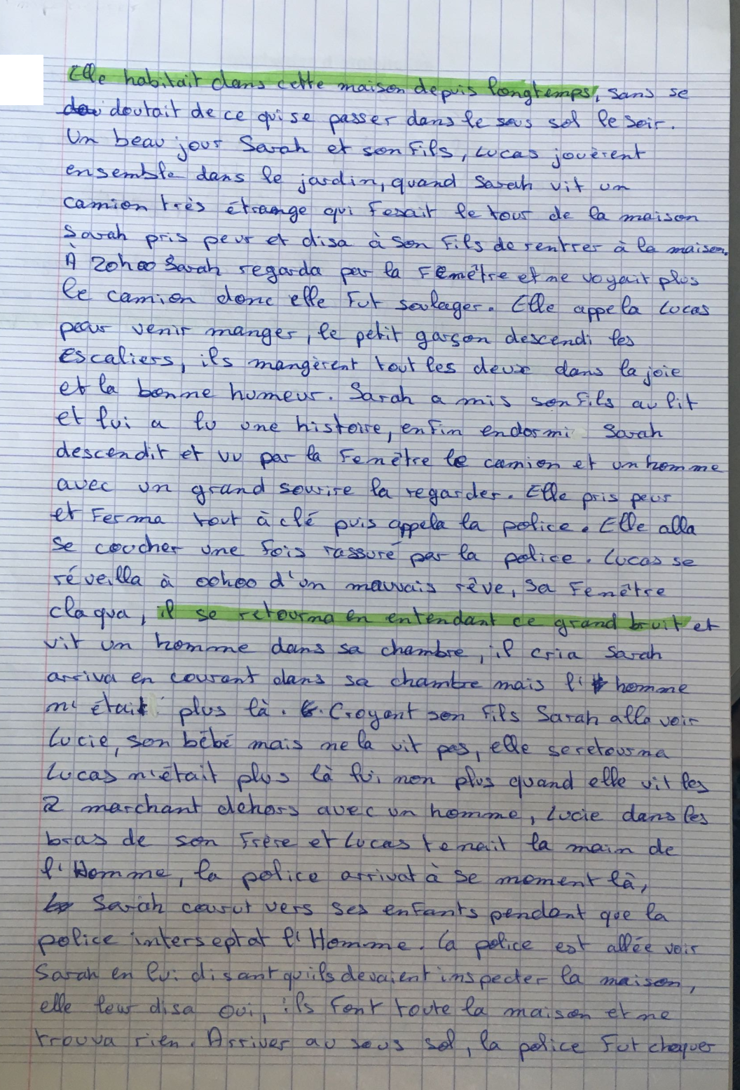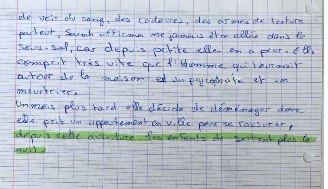 Elle habitait dans cette maison depuis longtemps , sans se douter de ce qui se passait dans le sous sol le soir . Un beau jour Sarah et son fils Lucas jouèrent ensemble dans le jardin , quand Sarah vit un camion très étrange qui faisait le tour de la maison . Sarah prit peur et dit à son fils de rentrer à la maison . À 20 h00 Sarah regarda par la fenêtre et ne voyait plus le camion donc elle fut soulager . Elle appela Lucas pour venir manger , le petit garçon descendit les escaliers , ils mangèrent tous les deux dans la joie et la bonne humeur . Sarah a mis son fils à le lit et lui a lu une histoire , enfin endormi , Sarah descendit et vit par la fenêtre le camion et un homme avec un grand sourire la regarder . Elle prit peur et ferma tout à clé puis appela la police . Elle alla se coucher une fois rassurée par la police . Lucas se réveilla à 00 h00 d' un mauvais rêve , sa fenêtre claqua , il se retourna en entendant ce grand bruit et vit un homme dans sa chambre , il cria Sarah arriva en courant dans sa chambre mais l' homme n' était plus là . Croyant son fils , Sarah alla voir Lucie , son bébé , mais ne la vit pas , elle se retourna Lucas n' était plus là lui non plus quand elle vit les xxx marchant dehors avec un homme , Lucie dans les bras de son frère et Lucas tenait la main de l' Homme , la police arriva à ce moment là , Sarah courut vers ses enfants pendant que la police intercepta l' Homme . La police est allée voir Sarah en lui disant qu' ils devaient inspecter la maison , elle leur dit oui , ils font toute la maison et ne trouvèrent rien . Arrivée à le sous sol , la police fut choquée de voir de le sang , des cadavres , des armes de torture partout , Sarah affirma ne jamais être allée dans le sous-sol , car depuis petite elle en a peur . Elle comprit très vite que l' Homme qui tournait autour de la maison est un psychopathe et un meurtrier Un mois plus tard elle décida de déménager donc elle prit un appartement en ville pour se rassurer , depuis cette aventure les enfants ne sortent plus la nuit . |